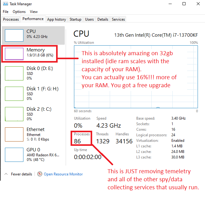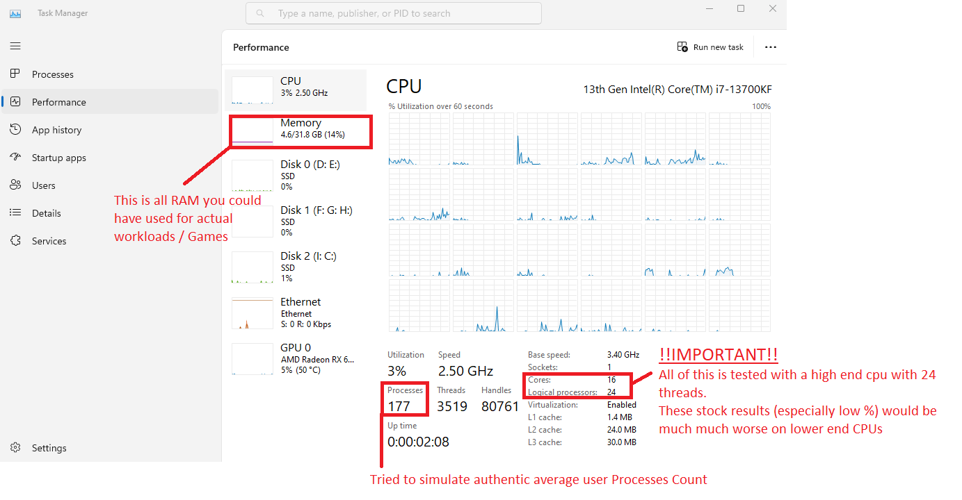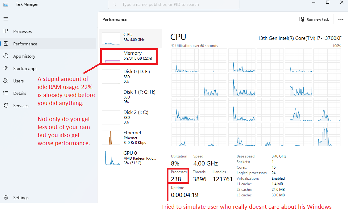 Keep in mind this was on a “High End” chip, 13700KF. Now imagine all the bloat on a CPU with less cores / threads / no E-cores.